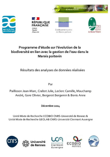 L’Établissement Public du Marais poitevin (EPMP), dans le cadre du Schéma Directeur d’Aménagement et de Gestion des Eaux 2016-2021, mène un programme de suivi de la biodiversité en lien avec la gestion de l’eau sur 11 secteurs du Marais poitevin. La coordination scientifique est confiée au laboratoire Ecobio (Université de Rennes 1 & CNRS) et les suivis sont engagés depuis 2014. Cette étude à une demande du SDAGE Loire-Bretagne et s’inscrit dans le CT cadre du territoire et le DOCOB NATURA 2000.