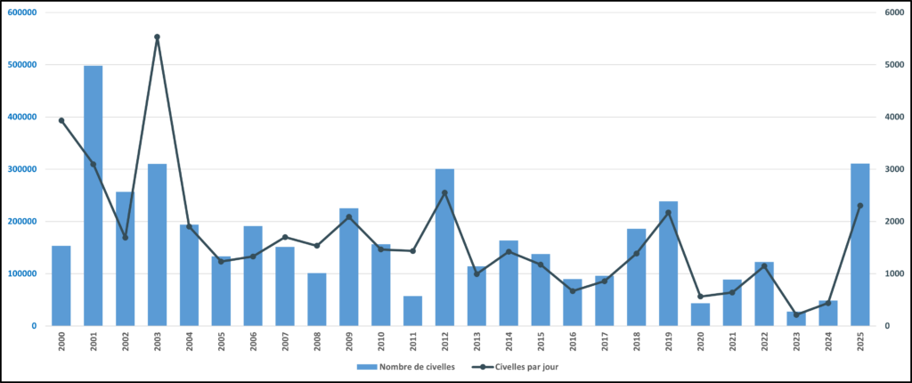 Malgré quelques légères remontées comme c’était le cas en 2012, 2018 puis 2019, les quantités de jeunes anguilles migrantes des années 80 n’ont jamais été atteintes.
